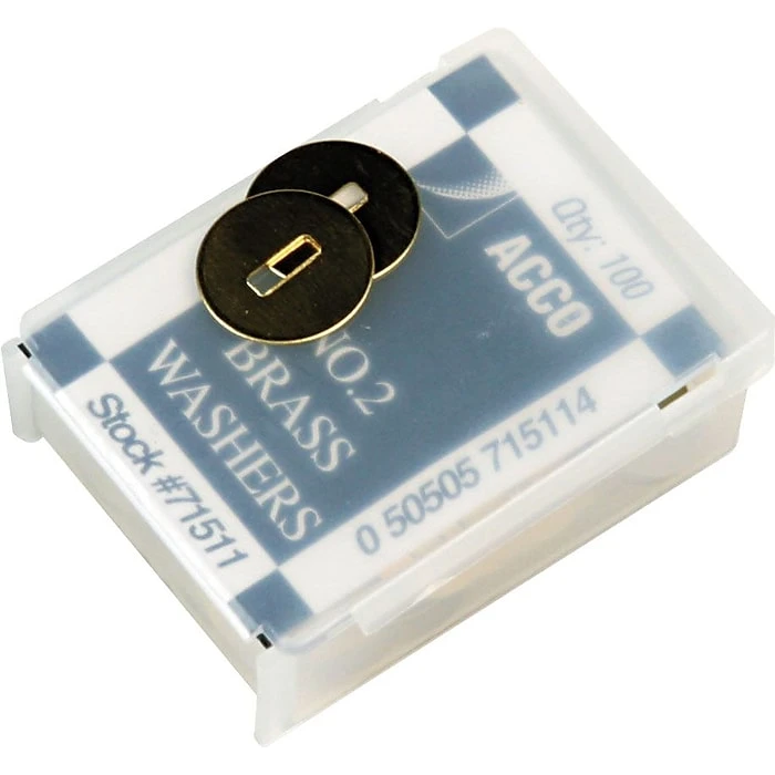 Acco Brass prong paper washer fits on 1 1/4″ of solid brass and roundhead fasteners. Brass washer is designed to prevent the tearing and used in washers top/bottom to get a tighter bind.