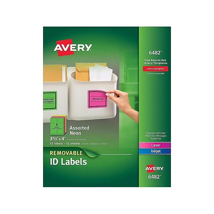 Enjoy quick, easy identification of paperwork, inventory, and other items with these removable assorted neon labels. These Avery removable identification labels come in a 72-pack, are compatible with laser or inkjet printers and come in a variety of neon colors, making them ideal for drawing attention to important files and other papers.