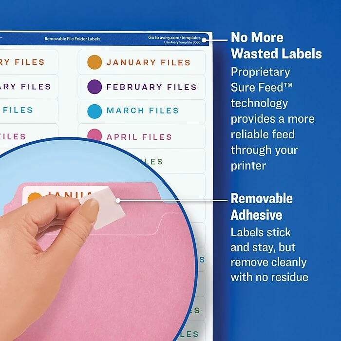 - These Avery Labels feature proprietary Sure Feed technology to deliver a more reliable feed through your printer, preventing misalignments and jams