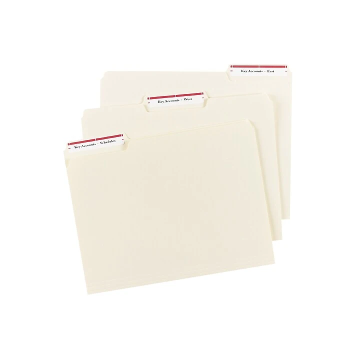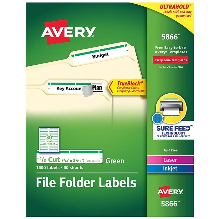 These file folder labels with red accent are ideal for color coding your file folders, documents and binders. File folder tab labels feature Sure Feed technology to deliver a more reliable feed through your printer to help prevent misalignments and jams—and that means no more wasted labels. TrueBlock technology completely covers up everything underneath the labels, so you can block out handwriting, markings and existing labels and reuse folders with a clean, professional look. Self adhesive file folder labels are guaranteed to stick and stay. Labels are available in a variety of colors. The red file folder labels 1/3 cut tabs can also be used for projects such as identifying objects and organizing containers. Customize with free templates and designs on Avery Design & Print (avery.com/templates), and print on inkjet or laser printers.