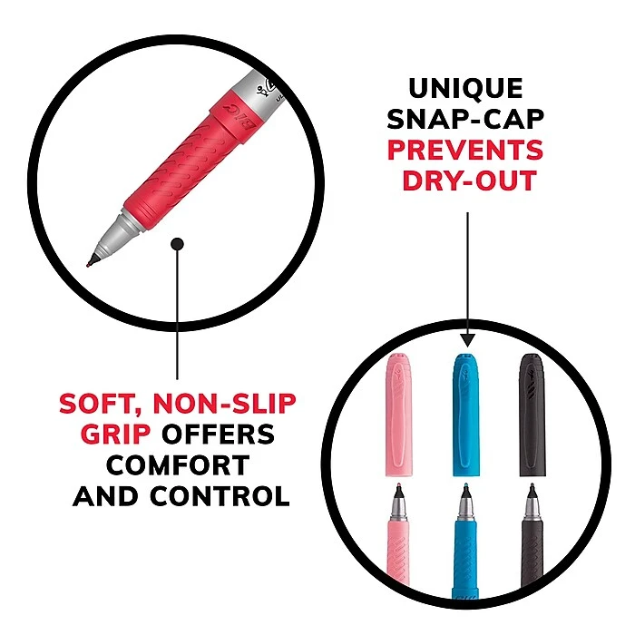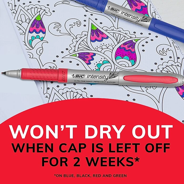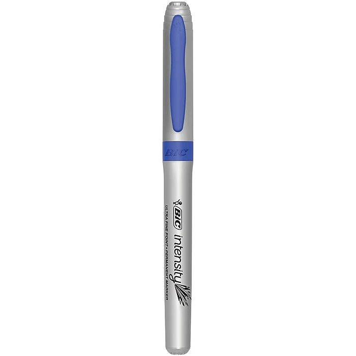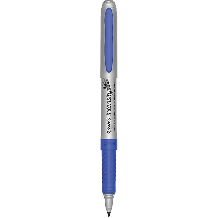 BIC Intensity Permanent Marker is a durable permanent marker with bold, long-lasting color. Each marker features a unique snap cap with a vapor seal locking mechanism to help prevent dry-out. The soft, non-slip grip offers comfort and enhanced control, while the durable ultra fine point creates crisp, precise marks ideal for detail work. Capable of marking on a wide variety of surfaces, this low-odor, non-toxic marker has acid free* ink, making it a great choice for use at home, school, or the office. Made in the USA of US and foreign parts. *No added acid; no measurable pH.
