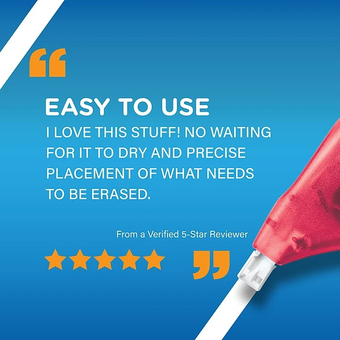 Quickly correct typed or handwritten documents with BIC White-Out Brand EZ Correct Correction Tape. Made by America’s #1 Correction Brand*, this correction tape goes on dry, allowing you to make instant corrections with no mess and no waiting time unlike the correction fluid white out liquid. Dispensing the tape is easy: simply hold the dispenser with your thumb in the groove, position the tip flat on your paper, press down firmly, and gently move from left to right. Offering greater strength than paper-based tape, this film-based correction tape is more tear resistant to create tidy, inconspicuous corrections that last. The self-winding mechanism helps prevent the tape from loosening, so you can apply the tape smoothly and accurately. And thanks to its translucent body, the dispenser lets you see how much tape is remaining.