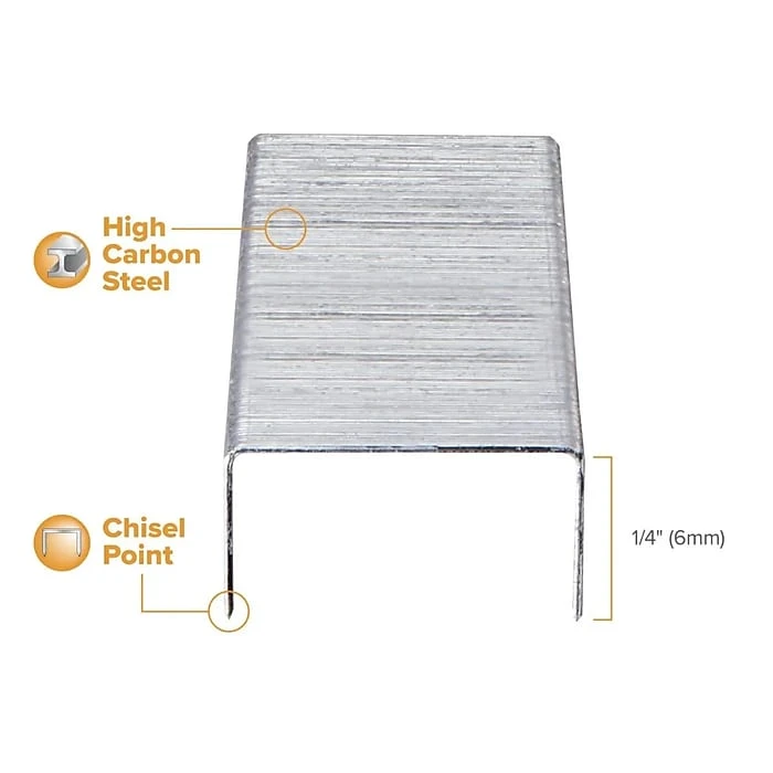 Our Premium Standard Staples were developed for optimum performance in any standard stapler. Each full strip contains 210 staples and is constructed from superior quality high carbon wire to reduce buckling and jamming. The finely honed chisel points deliver maximum penetration for maximum sheet capacity. These standard staples won’t snap or buckle like others of lesser quality. Developed from galvanized steel, these staples also resistant to rust. The leg length is an ideal 1/4” or 6mm. Each box of premium standard staples features a 5,000 staple quantity per box.