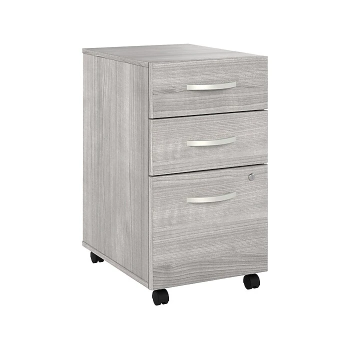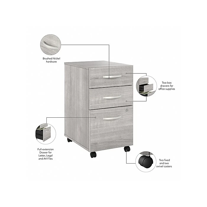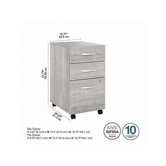 The Bush Business Furniture Hybrid three-drawer mobile file cabinet offers a stylish, long-lasting storage solution for the modern professional. Enjoy a neat and organized workspace with a file cabinet that conveniently rolls wherever you need access to important documents. The file drawer opens on smooth full-extension ball bearing slides for an effortless reach to letter, legal and A4-size paperwork, while a pair of box drawers organize writing utensils, notepads and more. The two bottom drawers can be secured by a single lock to protect sensitive files or personal items. The rolling file cabinet’s compact design allows it to fit underneath a standard-size office desk for a space-saving configuration. Find the perfect look for your space with five contemporary finish options: black walnut, modern hickory, platinum gray, storm gray, and white. This two-drawer file cabinet with wheels has been meticulously tested to meet or exceed ANSI/BIFMA quality standards for safety, durability, and performance and is backed by the Bush Business Furniture 10-year manufacturer warranty. See the full Hybrid collection for coordinating items to enhance your workspace as needed, including computer desks, bookcases, and storage cabinets (coordinating items sold separately). American-made with US and imported parts.