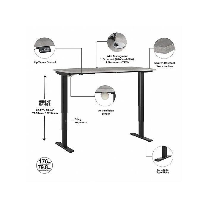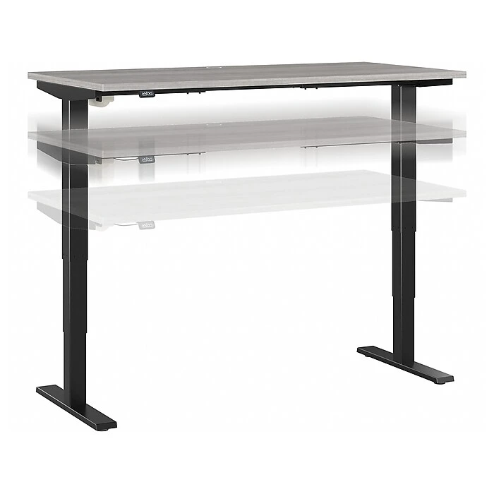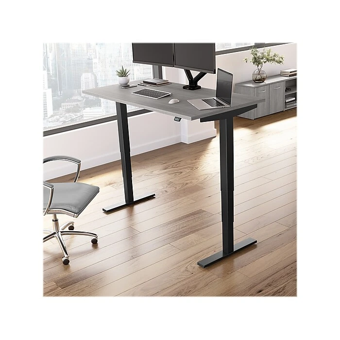 The Bush Business Furniture Move 40 height-adjustable standing desk is a perfect way to build an ergonomic workspace without the high-end price tag. Give your body and mind a break from sedentary work, and enjoy a healthier, more productive office with the push of a button. Three-stage units lift the desktop anywhere from 28″ to 48″ at a speed of 1.25″ per second, so you can change positions without missing a beat. The adjustable desk also features an anti-collision sensor that stops movement up or down if an object is detected. Available in several attractive finishes, the durable thermally fused laminate work surface resists scratches and stains, while a welded 16-gauge steel base allows the desktop to support up to 176 lbs. This sit-stand desk is tested to meet the ANSI/BIFMA quality standards for safety and performance and is backed by a 5-year manufacturer warranty.