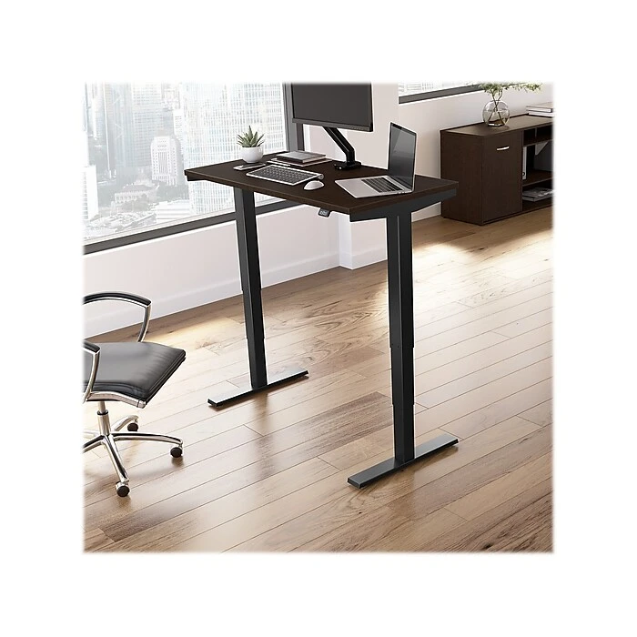 The Bush Business Furniture Move 40 height-adjustable standing desk is a perfect way to build an ergonomic workspace without the high-end price tag. Give your body and mind a break from sedentary work, and enjoy a healthier, more productive office with the push of a button. Three-stage units lift the desktop anywhere from 28″ to 48″ at a speed of 1.25″ per second, so you can change positions without missing a beat. The adjustable desk also features an anti-collision sensor that stops movement up or down if an object is detected. Available in several attractive finishes, the durable thermally fused laminate work surface resists scratches and stains, while a welded 16-gauge steel base allows the desktop to support up to 176 lbs. This sit-stand desk is tested to meet the ANSI/BIFMA quality standards for safety and performance and is backed by a 5-year manufacturer warranty.