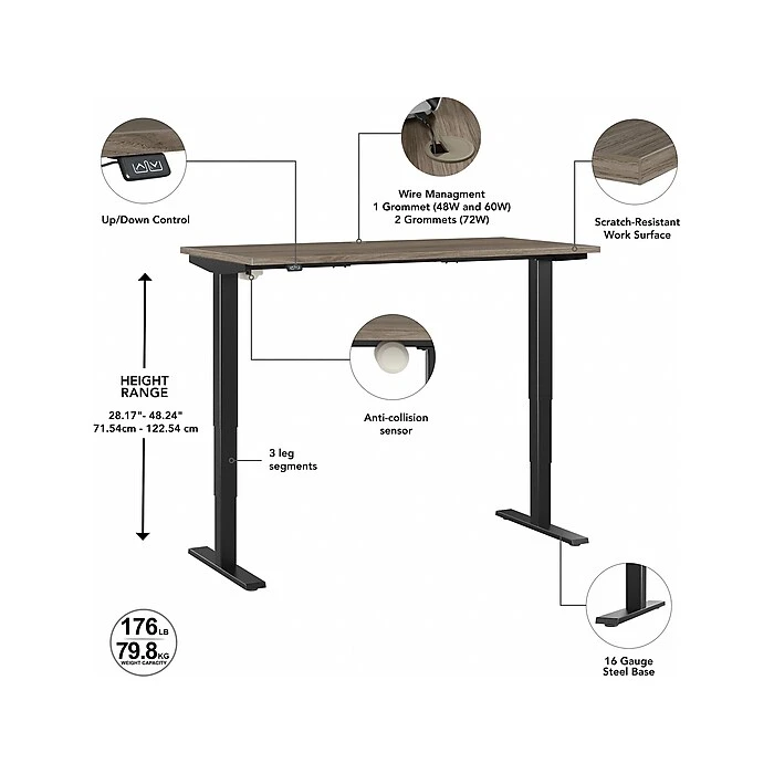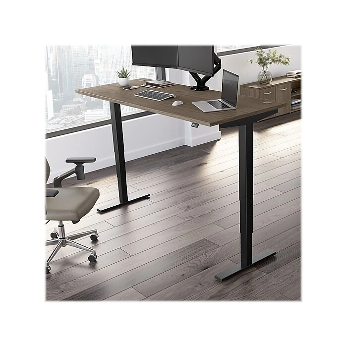 The Bush Business Furniture Move 40 height-adjustable standing desk is a perfect way to build an ergonomic workspace without the high-end price tag. Give your body and mind a break from sedentary work, and enjoy a healthier, more productive office with the push of a button. Three-stage units lift the desktop anywhere from 28″ to 48″ at a speed of 1.25″ per second, so you can change positions without missing a beat. The adjustable desk also features an anti-collision sensor that stops movement up or down if an object is detected. Available in several attractive finishes, the durable thermally fused laminate work surface resists scratches and stains, while a welded 16-gauge steel base allows the desktop to support up to 176 lbs. This sit-stand desk is tested to meet the ANSI/BIFMA quality standards for safety and performance and is backed by a 5-year manufacturer warranty.