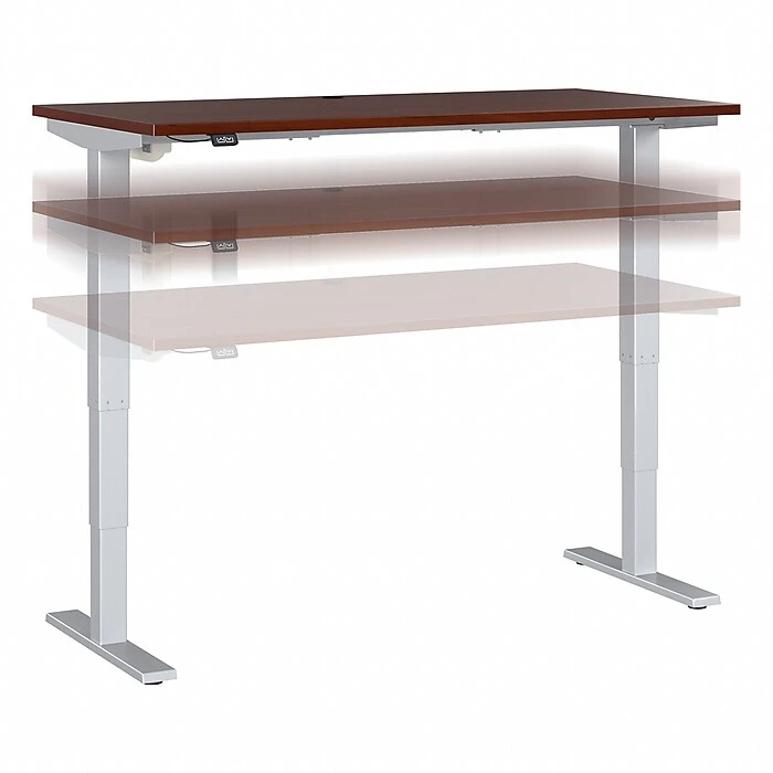 This Bush Business Furniture Move 40 height-adjustable desk is a perfect way to build an ergonomic workspace without a high-end price tag. Give your body and mind a break from sedentary work and enjoy a healthier, more productive office with the push of a button. Three-stage units lift the 59″W x 29″D desktop anywhere from 28.17″ to 48.24″ at a speed of 1.25″ per second so you can change positions without missing a beat. The adjustable desk also features an anti-collision sensor that stops movement up or down if an object is detected. The durable thermally fused laminate work surface resists scratches and stains while a welded 16-gauge steel base allows the desktop to support up to 176 lbs. This sit-stand desk meets or exceeds ANSI/BIFMA standards for safety and performance and is backed by a 5-year manufacturer limited warranty.
