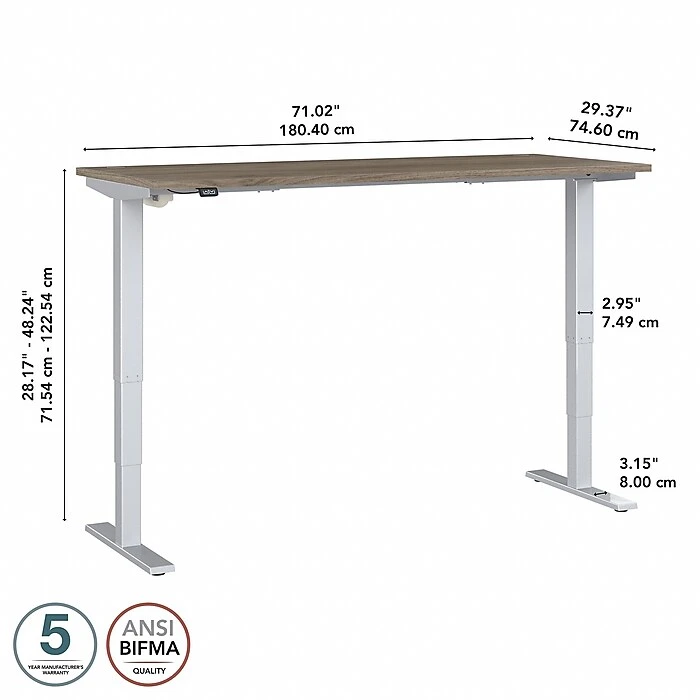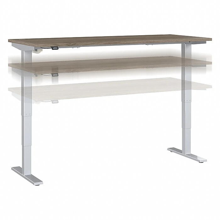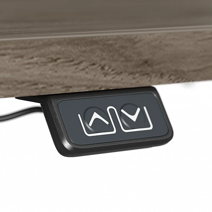 The Bush Business Furniture Move 40 electric height-adjustable standing desk is a perfect way to build an ergonomic workspace without the high-end price tag. Give your body and mind a break from sedentary work and enjoy a healthier, more productive office with the push of a button. Three-stage units lift the desktop anywhere from 28″ to 48″ at a speed of 1.25″ per second, so you can change positions without missing a beat. The adjustable desk also features an anti-collision sensor that stops movement up or down if an object is detected. Available in several finishes, the durable thermally fused laminate work surface resists scratches and stains, while a welded 16-gauge steel base allows the desktop to support up to 176 lbs. This sit-stand desk is tested to meet ANSI/BIFMA quality standards for safety and performance and is backed by a 5-year manufacturer warranty.