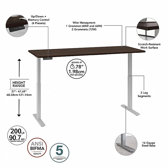 Have a healthy and productive day at the office with the Bush Business Furniture Move 60 electric height-adjustable standing desk. Those who use sit to stand desks report improved attitudes, energy, and comfort while getting more done, and the Bush Business Furniture Move 60 provides an affordable solution. The electric adjustable desk smoothly lifts from 27″ to 46.7″ at the push of a button. Store your favorite heights with four programmable presets, so you can use them as often as you like. The ergonomic desk withstands years of everyday use. A durable thermally fused laminate finish resists scratches and stains, while the sturdy steel base creates a weight capacity of up to 200 lbs. This sit-to-stand desk will have no problem holding all of your work materials. Backed by a 5-year warranty, the adjustable standing desk meets ANSI/BIFMA test standards.