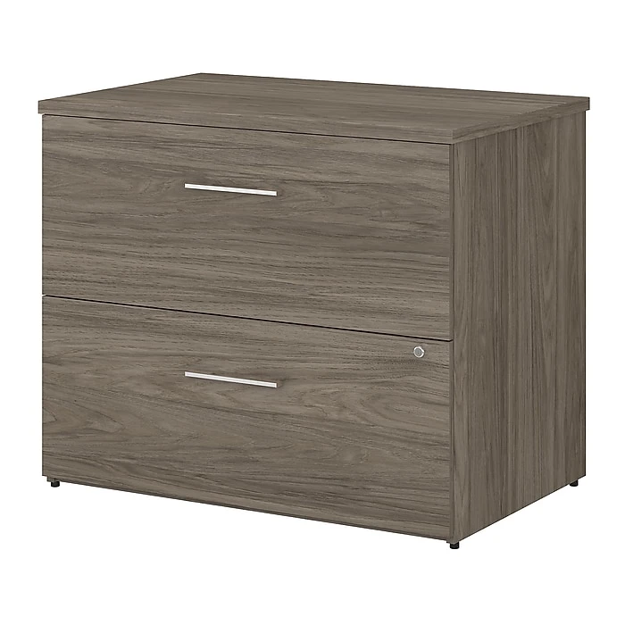 The Bush Business Furniture Office 500 two-drawer lateral file cabinet offers secure storage with a sophisticated look that fits the modern workplace. Organize important paperwork safely and efficiently with this lateral file cabinet. A great addition to any workspace, this file cabinet features two large drawers that accept legal-, letter-, and A4-size documents while supporting up to 88 lbs. each. Both drawers open on full-extension ball bearing slides for an easy reach to contents and are secured by a single lock to protect files that contain sensitive information. Drawers open one at a time for maximum stability, and the base includes adjustable levelers to compensate for uneven floors. One file cabinet accepts the coordinating 36″W bookcase hutch while two can accept a 72″W desk hutch (hutches sold separately). This locking file cabinet meets or exceeds ANSI/BIFMA quality standards for safety and performance and is backed by a 10-year manufacturer limited warranty. American-made with US and imported parts.