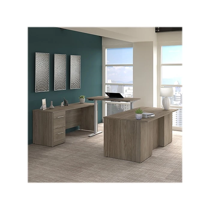 - Bundle includes: 71.02″W x 35.43″D executive desk, 71.02″W x 23.35″D credenza desk, 47.6″W x 23.35″D height-adjustable standing desk, 16″W three-drawer file cabinet, 16″W two-drawer file cabinet