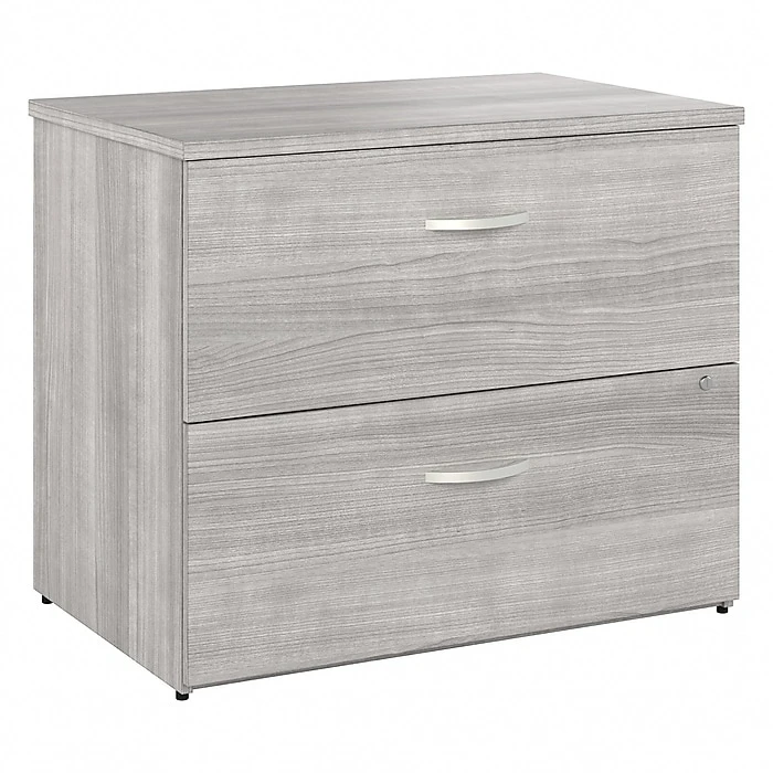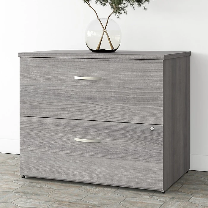 The Bush Business Furniture Studio A two-drawer lateral file cabinet combines a fresh contemporary appearance with the commercial-quality construction needed to withstand years of everyday use. Keep all your letter-, legal-, and A4-size documents organized inside two drawers that open on full-extension ball bearing slides for an effortless reach to contents. A single lock secures both drawers to protect sensitive information and safeguard any personal items you don’t want left out in the open. Each drawer can hold up to 88 lbs. of materials. The lateral file cabinet’s stable design and wall attachment hardware make it safe for use in virtually any home or professional office. This two-drawer file cabinet has been meticulously tested to meet or exceed the ANSI/BIFMA standards for safety, durability, and performance and is backed by a 10-year manufacturer limited warranty. American-made with US and imported parts.