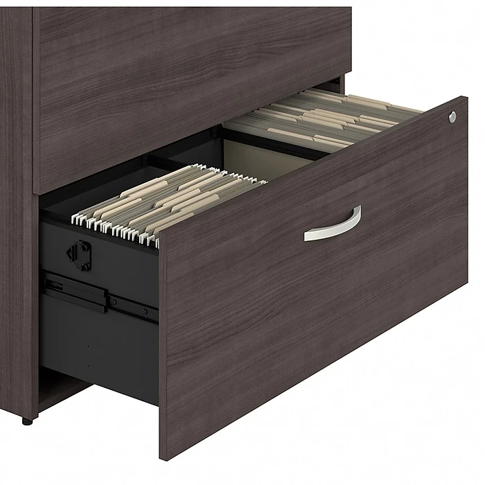 The Bush Business Furniture Studio A two-drawer lateral file cabinet combines a fresh contemporary appearance with the commercial-quality construction needed to withstand years of everyday use. Keep all your letter-, legal-, and A4-size documents organized inside two drawers that open on full-extension ball bearing slides for an effortless reach to contents. A single lock secures both drawers to protect sensitive information and safeguard any personal items you don’t want left out in the open. Each drawer can hold up to 88 lbs. of materials. The lateral file cabinet’s stable design and wall attachment hardware make it safe for use in virtually any home or professional office. This two-drawer file cabinet has been meticulously tested to meet or exceed the ANSI/BIFMA standards for safety, durability, and performance and is backed by a 10-year manufacturer limited warranty. American-made with US and imported parts.