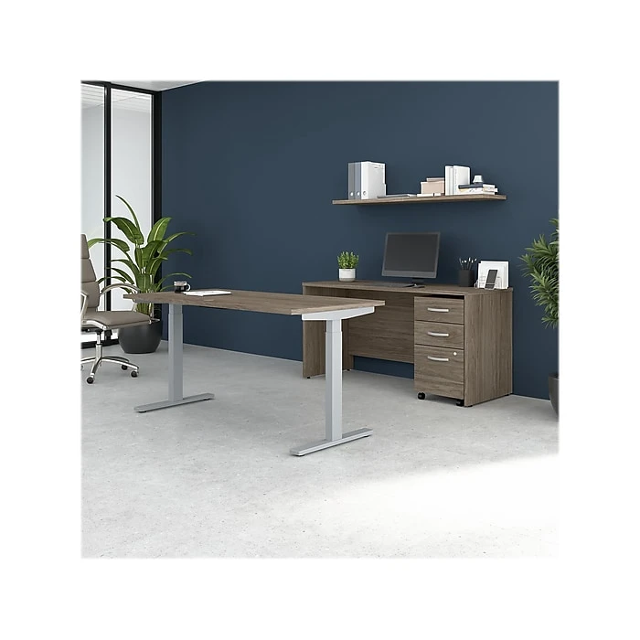 This Bush Business Furniture Studio C electric height-adjustable standing desk and credenza set combines wide work surfaces with a comfortable design and convenient features to keep you on task. Sit and stand throughout your day without missing a beat. The electric adjustable desk includes a 10′ power cord and smoothly lifts from 27″ to 46.7″ at the push of a button. Store your favorite heights with four programmable presets, so you can use them as often as you like. Make room to spread out and work on a variety of projects on the 60″W credenza desk while storing your paperwork inside the mobile file cabinet. For your letter-, legal-, and A4 size files along with office supplies, the contemporary cabinet rolls anywhere or remains in place as needed. Backed by a 10-year manufacturer warranty and meets the ANSI/BIFMA quality standards. American-made with US and imported parts.