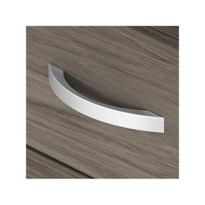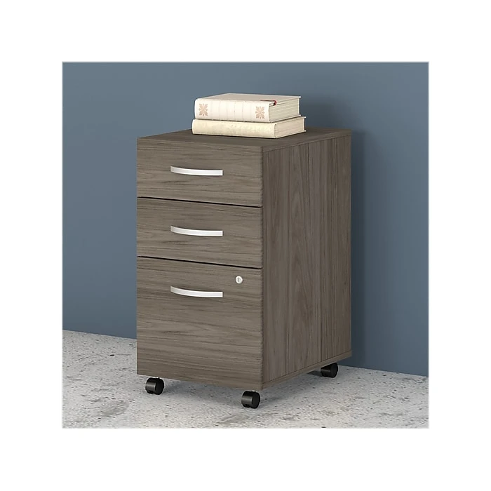 The Bush Business Furniture Studio C three-drawer mobile file cabinet rolls with you throughout your office or remains in place as needed on any surface. You’ll have your letter-, legal-, and A4-size paperwork organized in no time as the file cabinet ships fully assembled. Two box drawers hold your pens, notepads, and small office supplies. The file drawer opens on full-extension ball bearing slides, making it easy to reach papers at the back. Dual-wheeled, hooded casters keep the three-drawer cabinet moving on your floor or carpet. A single lock secures the bottom two drawers to protect sensitive paperwork and personal items. Eye-catching brushed nickel drawer pulls complement the beautiful finish. The mobile file cabinet comes with a 10-year manufacturer warranty and meets ANSI/BIFMA quality test standards. American-made with US and imported parts.