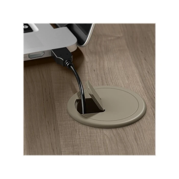 - Monitor arm (not included) can be installed in the desk’s wire management grommets