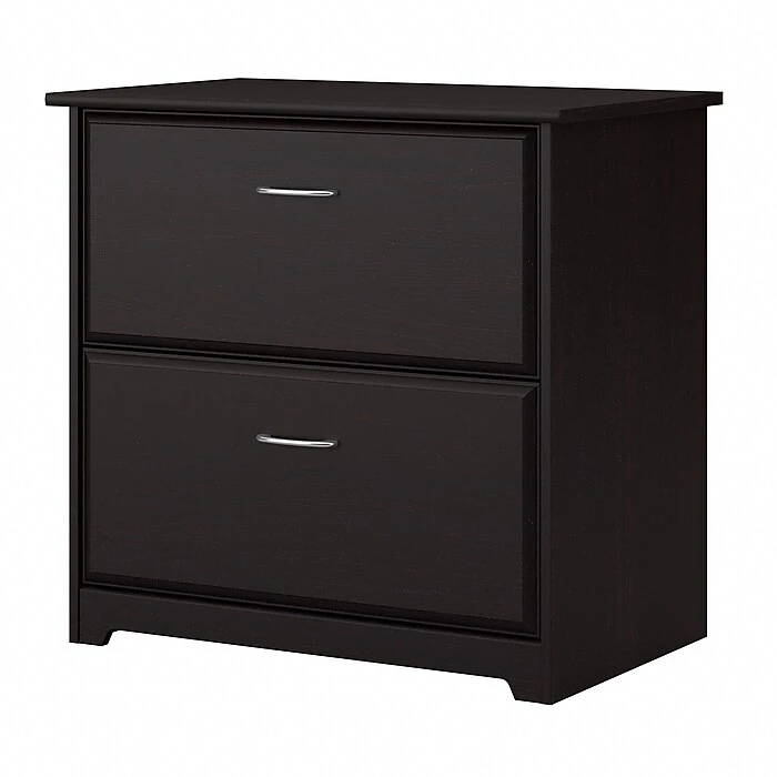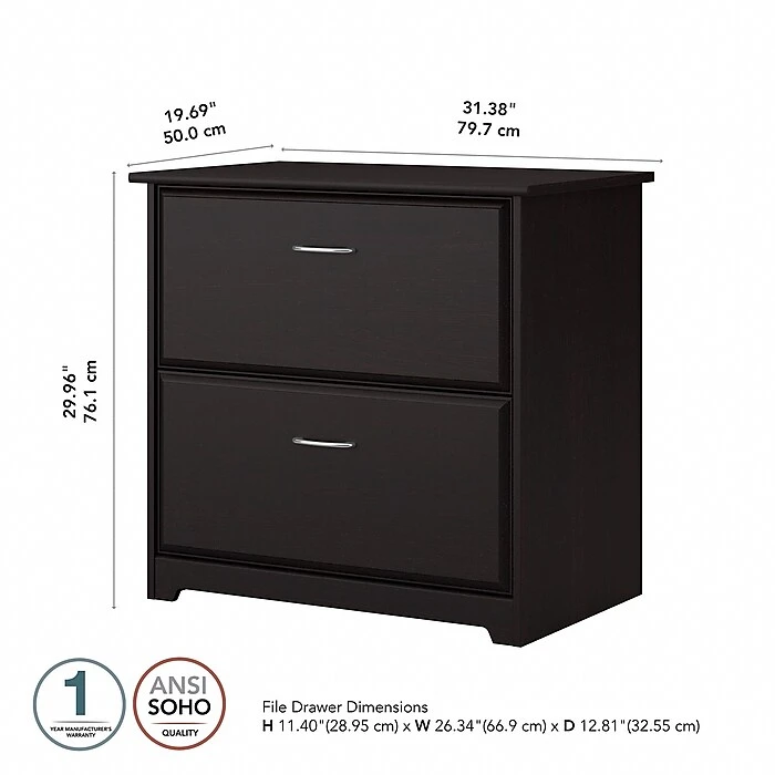 The Bush Furniture Cabot Lateral File Cabinet is a great option to organize important documents in your home office. When used next to the Cabot Corner Desk or L Shaped Desk (sold separately), the 2 drawer File Cabinet serves as an extension to your work surface as they match in height. Featuring two spacious drawers, the Lateral File Cabinet is crafted to hold both letter and legal-size files with ease. Each drawer is fitted with Chrome-finished handles and full-extension ball bearing slides that help with easy reach to the back with a smooth open and close. Quality construction meets ANSI/SOHO test standards for safety and performance. The filing cabinet provides a simple, elegant and timeless appearance, and comes with a 1 Year Warranty. See the full collection for coordinating items.