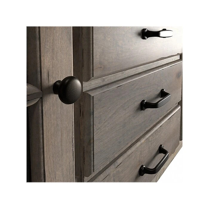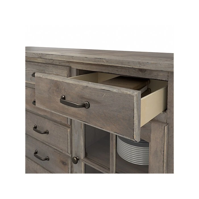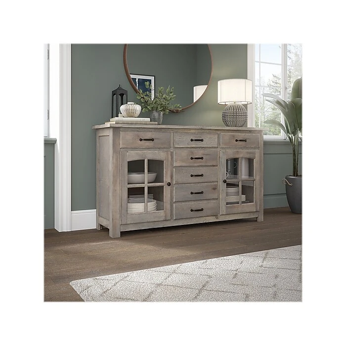 The Bush Furniture Leonis 62″W buffet cabinet presents a practical dinner and drinkware storage solution with style to suit your casual home. A durable post leg design and decorative wood detailing create a relaxed appearance that perfectly complements farmhouse, rustic, and vintage furniture. Two storage cabinets with glass doors and one disguised as drawers make it easy to organize plates and cups of various sizes. Take advantage of three drawers to stash eating utensils, bar accessories, napkins, coasters, and more. The credenza’s surface offers plenty of room to brighten up your space with plants, pictures, and decorations. Skip the hassle of assembly with a sideboard cabinet that’s ready to use right out of the box. This buffet cabinet has been rigorously tested to meet Bush Furniture’s standards for safety, durability, and performance and is backed by a 1-year manufacturer warranty.