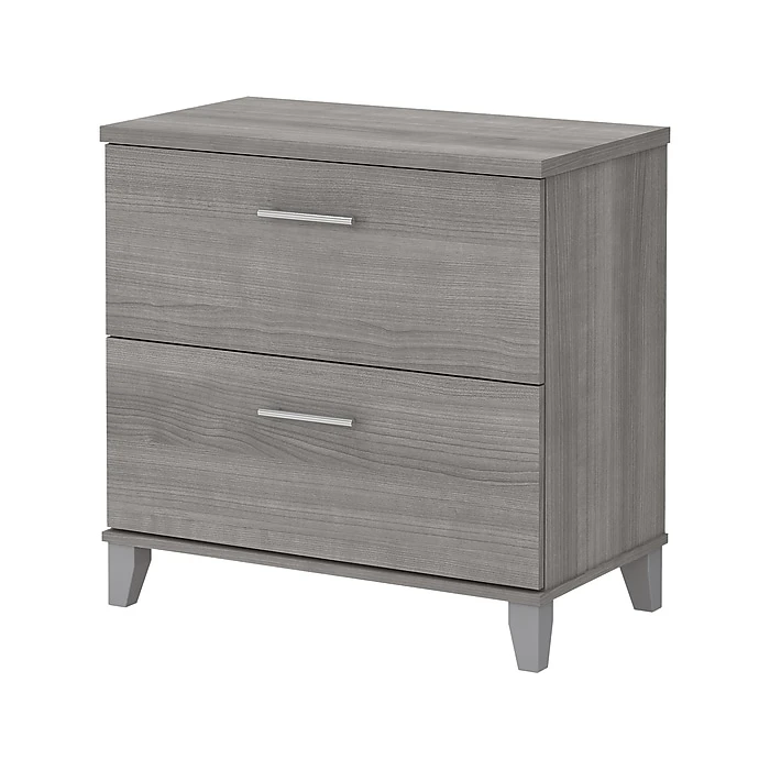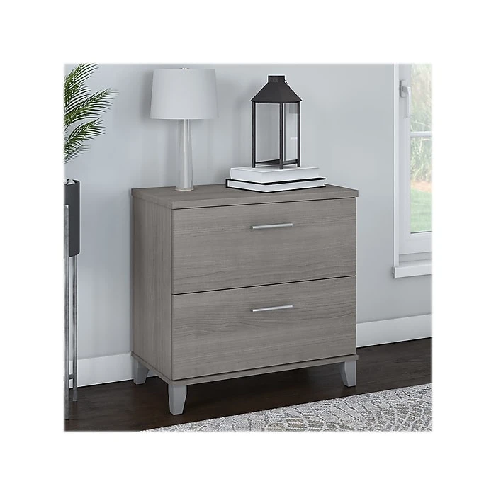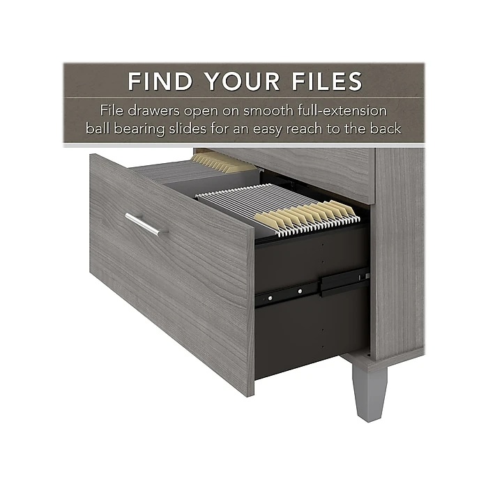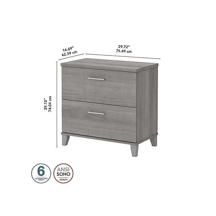 The Bush Furniture Somerset two-drawer lateral file cabinet provides an appealing home office storage solution. Two large file drawers open on smooth full-extension ball-bearing slides for easy access to letter- and legal-size documents, even those all the way at the back. The drawers are designed to open one at a time for maximum stability, making this file cabinet a safe and family-friendly addition to your home. The height of the two-drawer file cabinet matches any Somerset desk (sold separately) to allow for an extended work surface when placed side by side. Transitional styling includes tapered leg accents, your choice of attractive finishes, and contemporary metal hardware. This lateral file cabinet is tested to meet ANSI/SOHO quality standards for safety and performance and is backed by the Bush Furniture 6-year manufacturer warranty. American-made with US and imported parts.