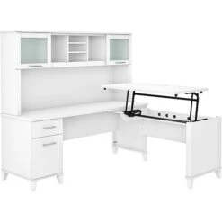 The Bush Furniture Somerset 72″W three-position sit to stand L-shaped desk with hutch offers a perfect solution for those seeking for a stylish and functional ergonomic workspace. The built-in mechanical Lift-n-Lock system allows the desktop to lock into place at standing heights of 35″, 38″, and 41″ and easily return to a seated position. This office desk includes a file drawer that opens on full-extension ball bearing slides for easy access to legal- and letter-size documents and a box drawer for supplies and utensils. The hutch attaches to the desktop and adds two frosted glass doors for concealed storage in addition to open cubby spaces with two shelves. Fixed surfaces are tested to meet ANSI/SOHO standards for safety and performance while the mechanical lift is rigorously tested to Bush Furniture quality standards.