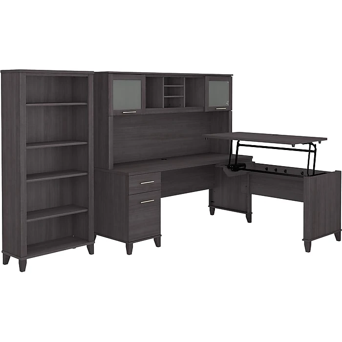 The Bush Furniture Somerset adjustable desk with hutch and bookcase offers an ergonomic solution for the home or small office. This furniture set is a perfect solution for those seeking for a stylish and functional ergonomic workspace. The mechanical Lift-n-Lock system allows the 42″W x 24″D return to lock into place at standing heights of 35″, 38″, and 41″ and easily return to a seated position. The 71″W x 24″D office desk has its own storage with a box drawer for supplies and a file drawer that holds legal- and letter-size documents. The hutch adds two frosted glass doors for concealed storage as well as open cubby spaces with two shelves. The bookcase features two fixed shelves and three shelves that can be adjusted. Fixed surfaces are tested to meet ANSI/SOHO standards for safety and performance while the mechanical lift is rigorously tested to Bush Furniture’s own quality standards. Backed by a 6-year manufacturer warranty.
