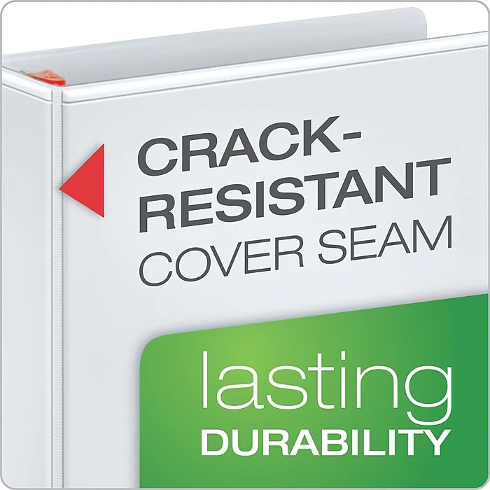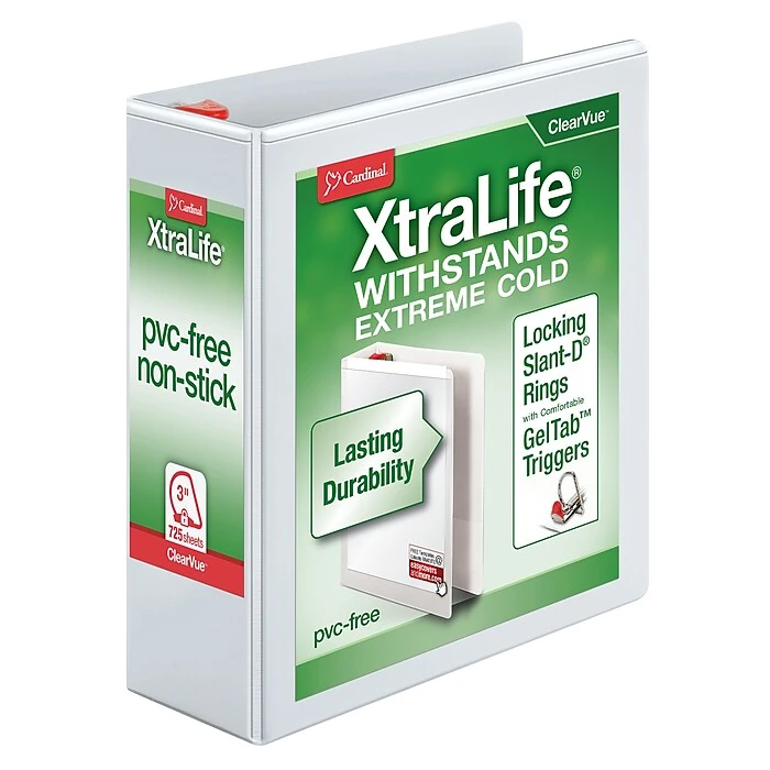 Cardinal XtraLife Slant-D three-ring non-stick locking ClearVue 3-inch white binders make it easy to flip through large reports and quickly find the information you need. Slanted rings make pages sit flatter while allowing for 25 percent more pages in a single binder. XtraLife material is easy to use, as it doesn’t stick to the dividers, plastic pages and tabs stored inside of the covers. These large binders store up to 725 sheets, which is perfect for archiving large files and detailed reports.