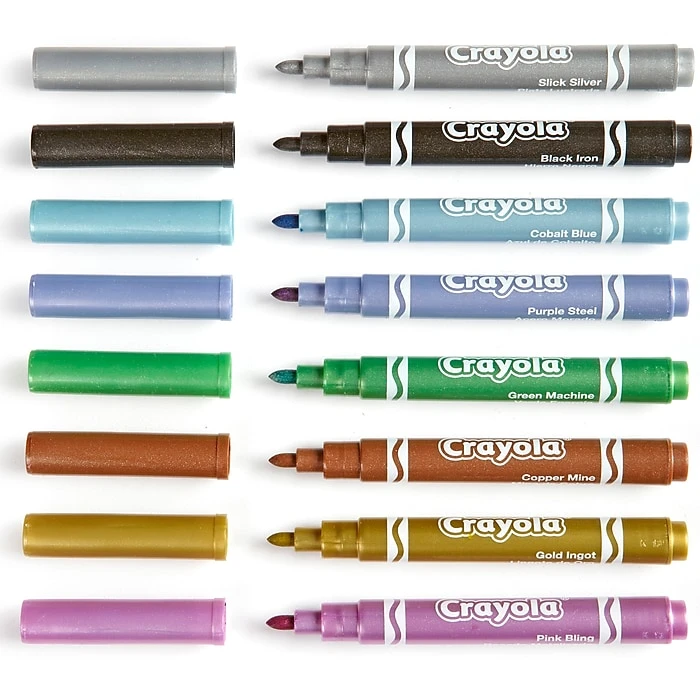 Rich, radiant and shiny! Crayola Metallic Markers add an extra sleek sheen to homemade cards, crafts and colorful art projects. Eight steely tones to choose from: Cobalt Blue, Purple Steel, Copper Mine, Green Machine, Slick Silver, Gold Ingot, Pink Bling and Black Iron.