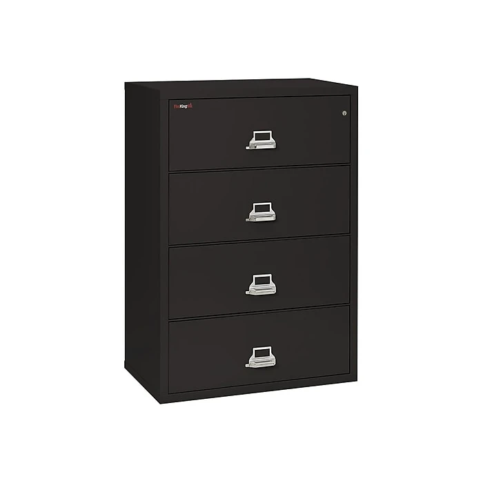 - Four-drawer lateral filing cabinet holds letter- or legal-size documents