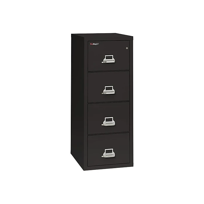 Use this heavily insulated file cabinet to organize letter-sized document folders. The inter-drawer insulation of this cabinet keeps files safe in the event of a fire, and the high-security key lock ensures that documents are for your eyes only. This vertical file cabinet comes equipped with water-resistant technology, which prevents water from damaging files. With four roomy drawers, this FireKing file cabinet offers enough space to store essential papers for optimum organization.