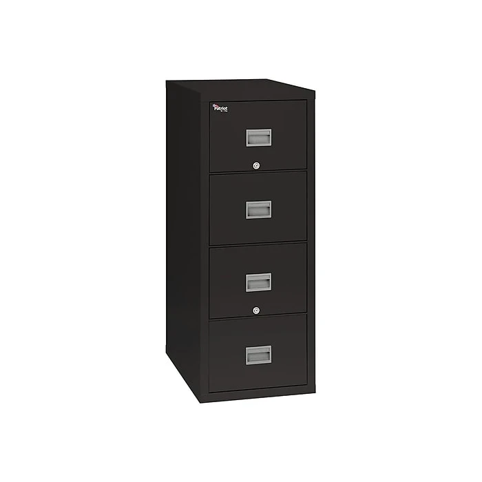 - Four-drawer vertical filing cabinet holds letter- or legal-size documents
