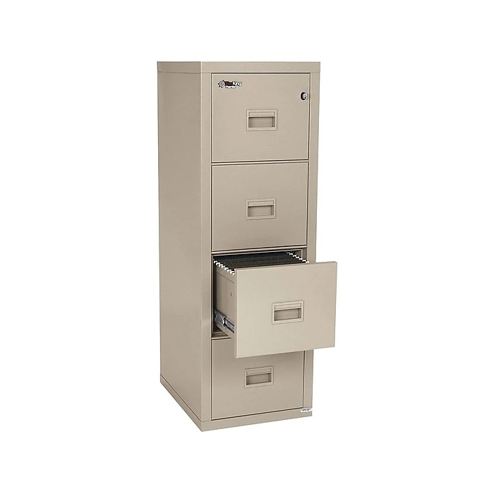 Store important paperwork in this FireKing vertical four-drawer fire-resistant file cabinet. The integrated lock prevents unauthorized access to sensitive documents, while the four spacious drawers maximize file storage space. A UL one-hour fire rating and water-resistant design defends your documents from damage during emergencies. This FireKing vertical four-drawer fire-resistant file cabinet boasts durable metal construction to withstand everyday wear and tear.