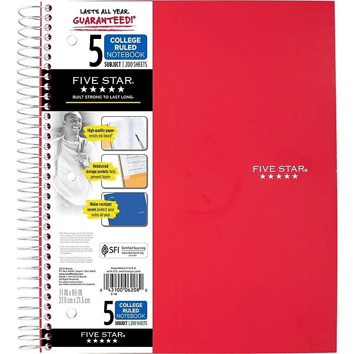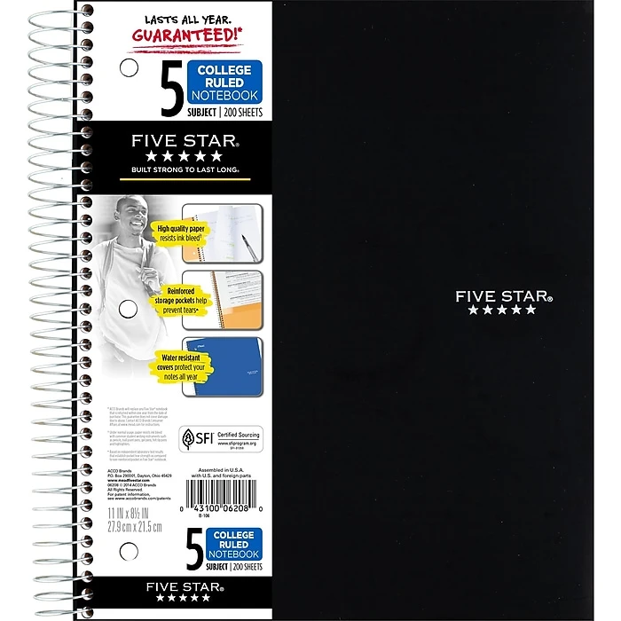 Be prepared in meetings, classes and other appointments with this five-subject wire-bound notebook. With two interior pockets, this notebook offers ample storage space, and the three-hole punch design lets you easily secure it into binders. This Five Star college-ruled notebook has 200 sheets of paper and a durable plastic front cover, providing long-term durability, while the wire-bound spine prevents snagging on clothing and backpacks.