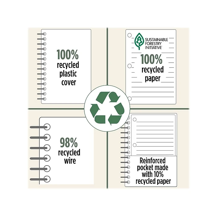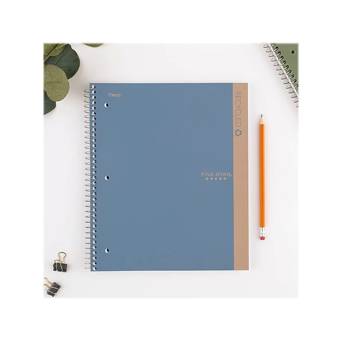 Choose the Five Star recycled notebook this year, which is made using recycled materials. The notebook gives you plenty of space to organize and jot down notes all year long. Scan, study, and organize your notes with the Five Star app. Create instant flashcards and sync your notes to Google Drive to access them anywhere from any device. This one-subject notebook has 100 double-sided college-ruled sheets made from 100% recycled post-consumer waste paper. The durable cover is made from 100% recycled plastic and the wire is 98% recycled.
