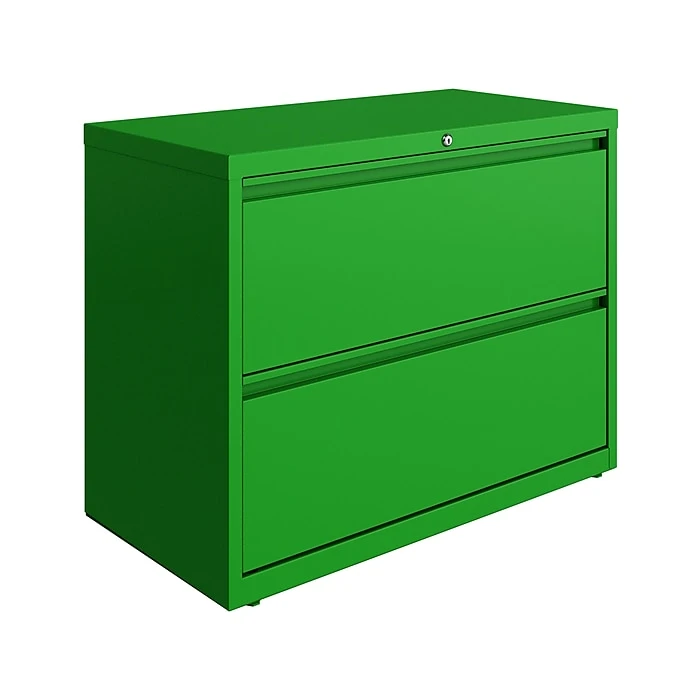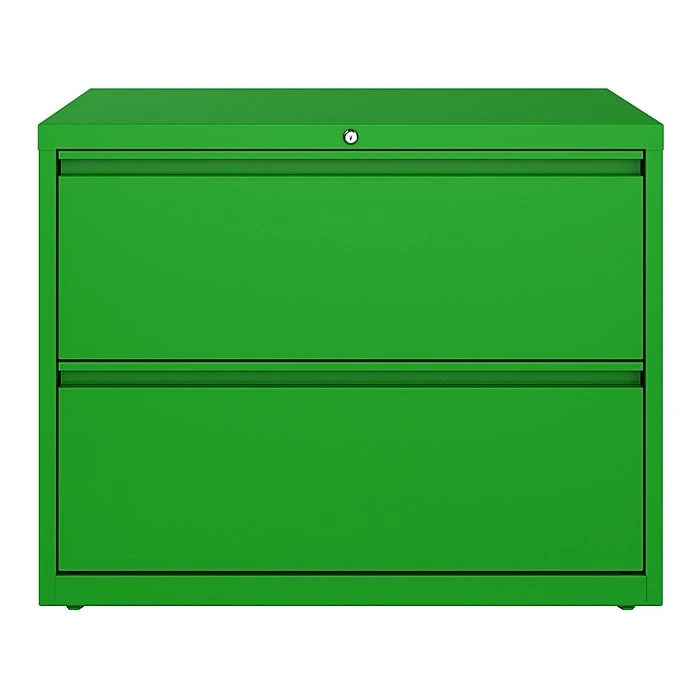 - Two-drawer lateral file cabinet holds letter-, legal-, or A4-size documents