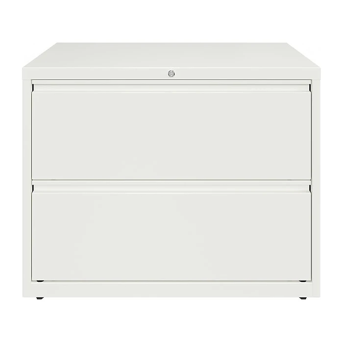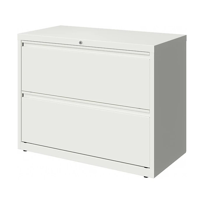 - Two-drawer lateral file cabinet holds letter-, legal-, or A4-size documents