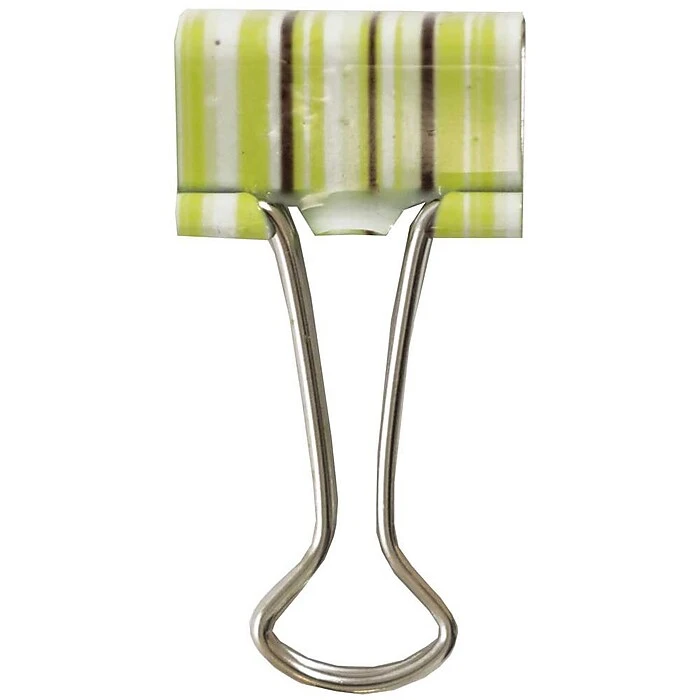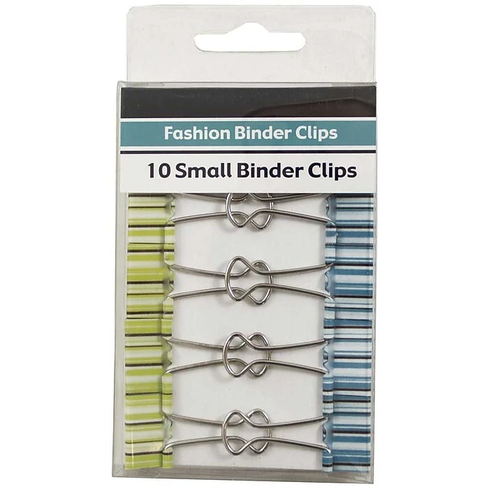 JAM Paper® Designer Binder Clips will get you organized in style! These small size binder clips measure at 19mm and are perfect for organizing and clipping documents together. The movable metal handle can be left upright so you can hang them up, or folded flat for easy storage. These clips are very versatile so use them for more then just clipping papers together! Use them to organize wires or cords, hang them from bulletin boards, or use them as stands for small items. These green and blue clips with brown and white stripes are made from durable metal, have a smooth, shiny finish, and are sold in packs of 10.