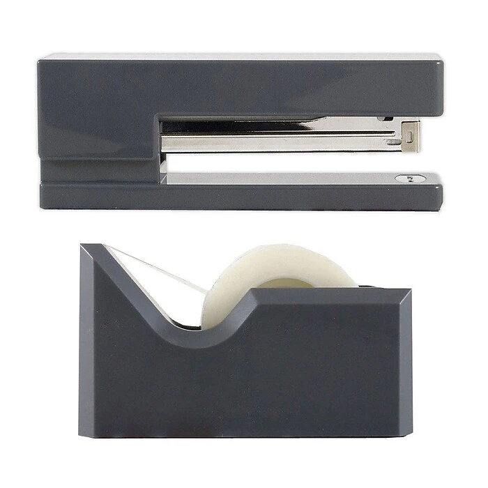 JAM Paper® Grey Office & Desk Set contains 1 stapler and 1 tape dispenser. Both of these desk supplies feature a versatile and professional grey color that will look great in any work space and on any desk. The stapler in this set is made of hard plastic and lightweight steel. It features a weighted bottom and has the capacity to fit over 200 staples at one time! The tape dispenser is also made of hard and durable plastic, and also has a weighted bottom to keep it anchored to a designated spot on your desk. With the capacity to fit one standard sized roll of clear tape, this dispenser features a sharp strip of metal on the front edge to help your tear off cleanly cut pieces of tape!