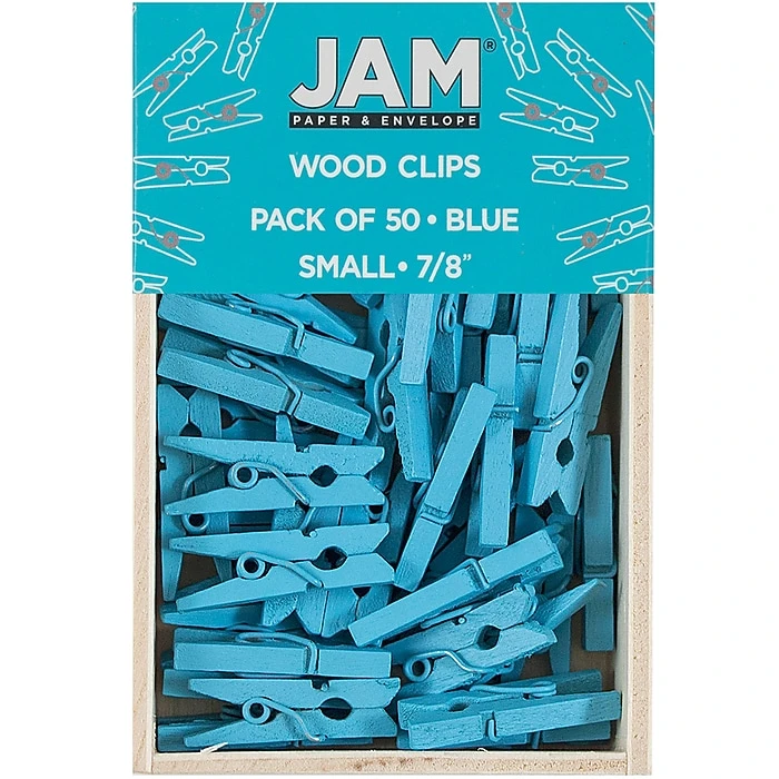 JAM Paper® Small Blue Wood Clothing Pin Clips are sold in wooden boxes of 50! Each pin measures 7/8 of an inch and is made of wood with a metal spring mechanism. These clothing style pins are painted with a beautiful shade of electric blue paint. Versatile and lightweight, these pins are great for fastening photos, memos, receipts, cash, note cards, place cards, and other small items to surfaces or string. Providing a light amount of pressure, there clips and be easily removed and reattached. Use these pins in your home or office! They are ideal for many crafts, organization projects, decorations, attached notes to party favors, and much more!
