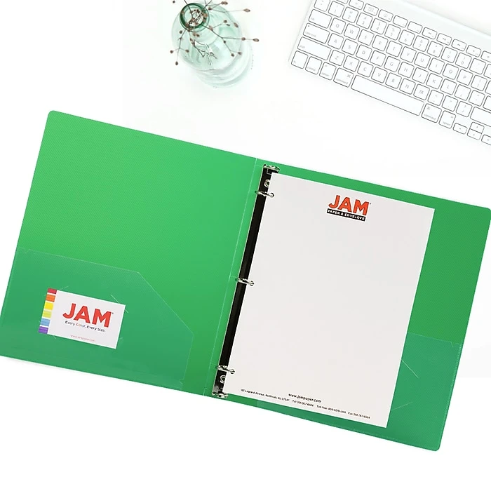 Sort papers by subject or department with these JAM Paper assorted 1-inch binders. Four vivid colors bring a bright look to schoolwork or office documents, and the durable plastic construction makes these binders ideal for everyday use. Featuring die-cut pockets on the inside covers, these JAM Paper assorted 1-inch binders let you add your business card for easy owner identification.