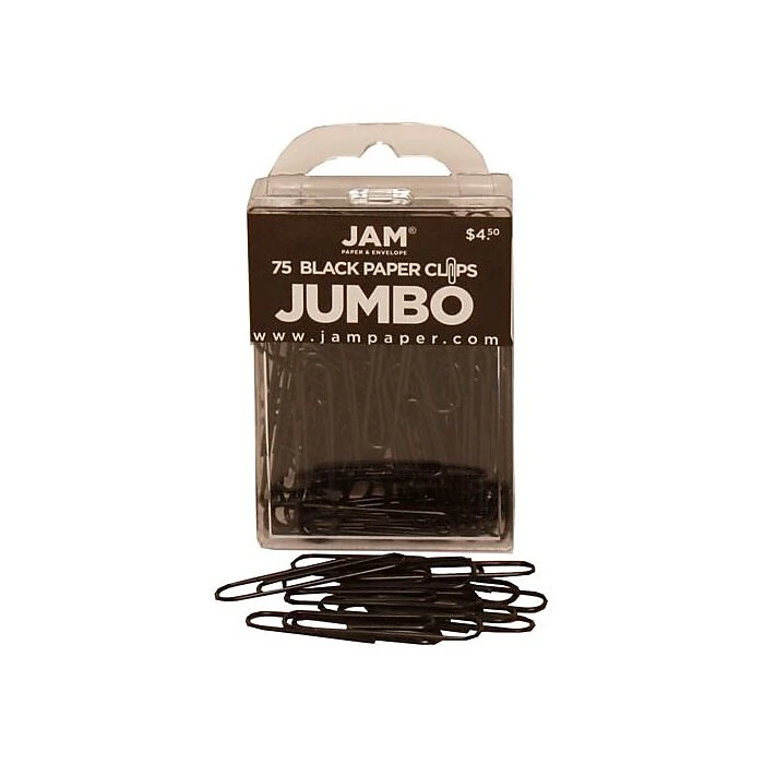 Forget those small-time, basic silver paperclips when you have JAM Paper® Colored Jumbo Paper Clips! Not only are these brightly colored, they are a huge size. These jumbo paperclips measure 2 inches long, so they will clip a variety of papers together securely. These particular clips are black, so they are sure to make a statement. They are neutral enough to use for any occasion, but they are bold enough to catch eyes and be different than the standard silver color. These paper clips are made of smooth metal and are the highest quality, sturdiest clips out there, so they won’t be bending or breaking easily. Use them around the house, the office, or at school. These paperclips are sold in packs of 75.