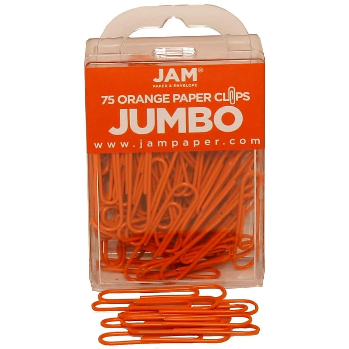 Bright and bold, these orange JAM Paper® Colored Jumbo Paper Clips are just what you need to make a statement with your documents, reports and organized papers. These clips are a particularly bold shade of orange, so they will certainly pop against anything you decide to clip together. These clips are made of smooth metal that is durable and reliable! Use them in the office, around the house and at school. Hey, you might even want to make a cool paperclip bracelet! You never know, the opportunities are endless. These jumbo clips measure 2 inches long and are the largest paperclips we sell. They are able to hold a large amount of papers. These clips are sold in 2 packs of 75. Size: 2 inches, Color: Orange, Quantity: 2/pack