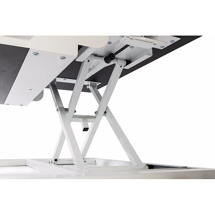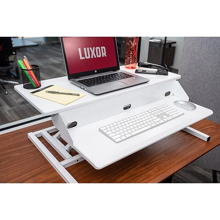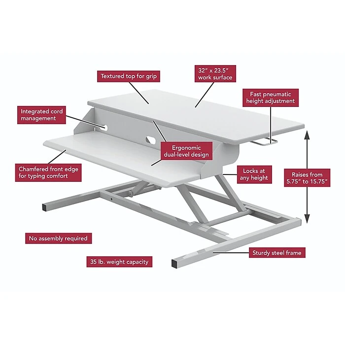 - Transitions height from sitting to standing in seconds with an easy pull of a single lever