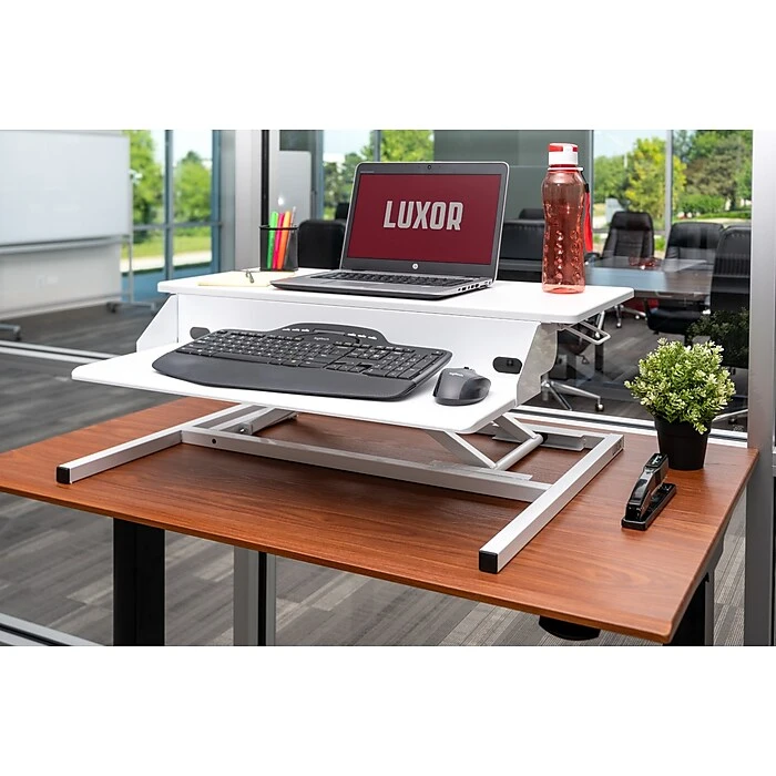 - Height adjustable workstation with two-tier design for ergonomic placement of keyboard, mouse, and monitors