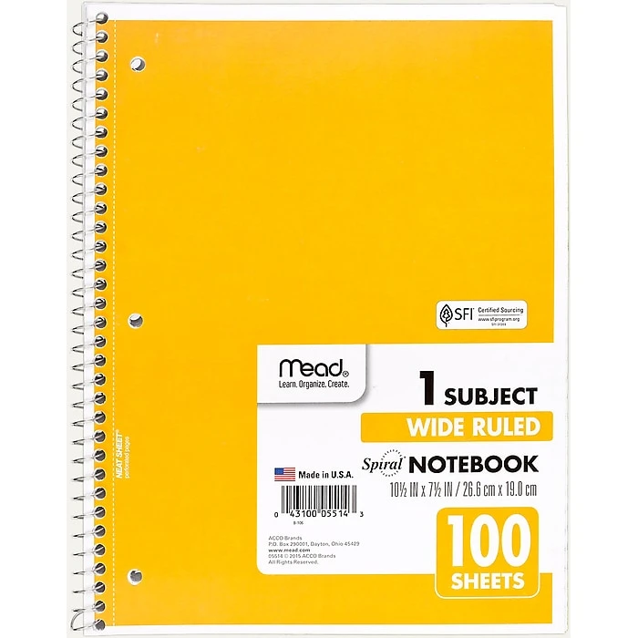 This basic 1 subject notebook is wide ruled and available in a variety of colors. It’s versatile and perfect for a variety of uses including in-class notetaking and recording meeting notes. This is a single notebook and the color is choosen at random from the available colors shown.