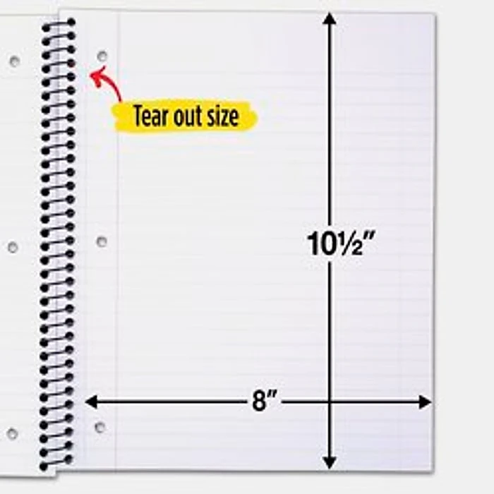 - 5 subject notebook has 200 double-sided, wide ruled sheets that fight ink bleed and are perforated for easy tear out. Sheets measure 8″ x 10 1/2″ when torn out.