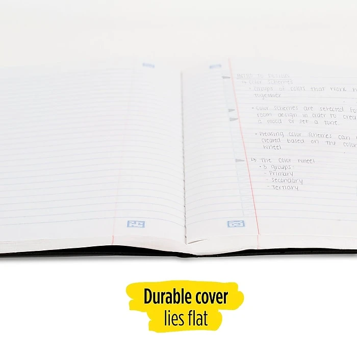 - College ruled sheets are securely sewn in, and the durable one-piece plastic cover protects notes all year long. Cover lies flat when open for easy notetaking.
