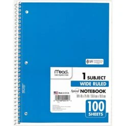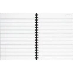 Write ideas, essays and other notes in this spiral notebook. The college-ruled spacing lets you fill this notebook with more words, and the wire-bound spine securely keeps sheets together and is resistant to uncoiling.One notebook per order, color chosen at random.