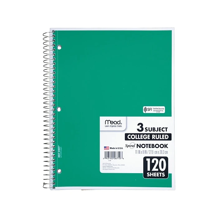 Be prepared for meetings, classes and other appointments by using this three-subject spiral notebook. Featuring college-ruled and double-sided pages, this notebook has plenty of space for drawings, lists and other notes, and the spiral binding prevents pages from tearing out. This Mead college-ruled assorted-color spiral notebook comes with 120 sheets and has three subject tabs, making it easier to get organized. The 3-hole punched feature leets you store pages or the entire notebook in a standard size binder.