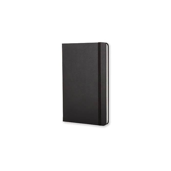 Carry this black cardboard classic notebook in a pocket or bag for easy access to notes. The cardboard cover of this notebook protects pages from folding, wrinkling and other damage, while the rounded corners prevent cuts and snagging. This Moleskine classic notebook has a built-in pocket for holding small accessories or notes, while the elastic closure lets you seal it tightly shut.